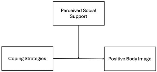 Additionally, guided by the Social Support Buffer Theory [23], which emphasizes the protective role of social support in mitigating the adverse psychological and physical effects of stress, this study aimed to address an important gap in the literature by exploring the moderating role of perceived social support in the relationship between coping strategies and positive body image (see Figure 1 for the conceptual model proposed). While prior research has examined the general benefits of social support and its impact on mental health outcomes, in the context of cancer [24,25,26,27], little is known about how social support interacts with coping strategies to foster positive body image in young women with BC.