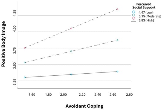 Moderation analyses were subsequently conducted using the PROCESS macro for SPSS (Version 4.2) [38] to examine whether perceived social support moderated the relationships between avoidant coping and positive body image, as well as between problem-focused coping and positive body image. The moderation analysis was conducted using 5000 bootstrap samples with a 95% confidence interval. Conditional effects were examined at three levels of perceived social support: one standard deviation (−1 SD) below the mean (low support), the mean (moderate support), and one standard deviation (+1 SD) above the mean (high support).