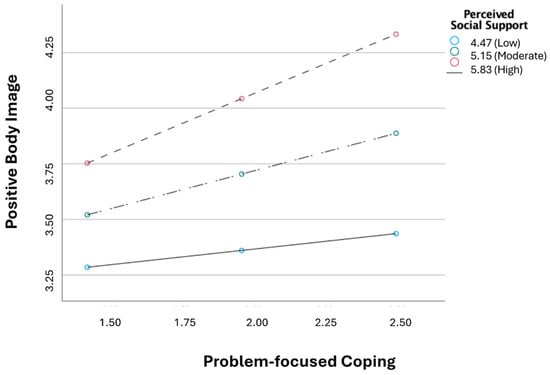 Problem-focused coping had a significant negative main effect on positive body image, suggesting that higher levels of problem-focused coping were associated with lower levels of positive body image. Perceived social support did not exhibit a significant main effect (see Table 3).