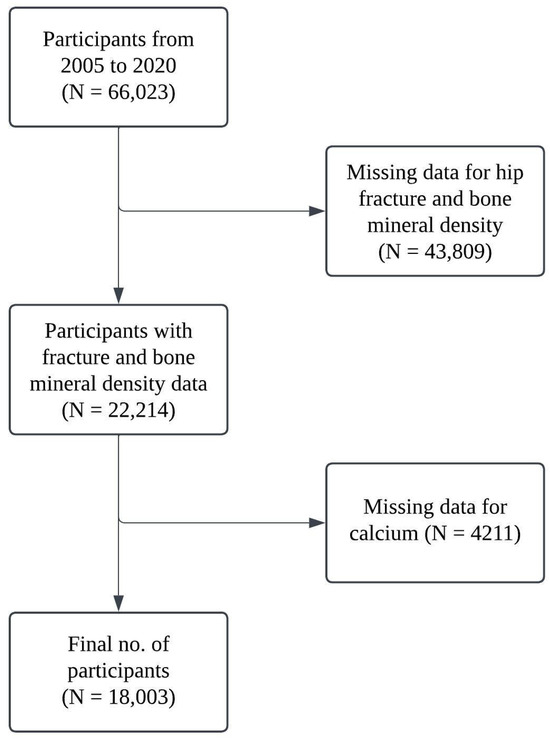 All participants who completed the relevant NHANES survey were included in the study, and participants with missing data on key variables were excluded. In this study, 66,023 participants were enrolled initially in the period from 2005 to 2020, and 43,809 participants have missing data in relation to hip fracture and bone mineral density. Ultimately, 18,003 participants were included in this study with complete data for both calcium intake and total calcium. A workflow chart of the participants is presented in Figure 1.