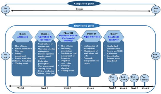 Data collection was conducted from 3 October 2022 to 30 January 2023, after obtaining approval from the nursing department of Chonnam National University Hospital. The PEEP consisted of five sessions, with each session held once a week for one hour, resulting in a total training period of five weeks. All sessions included a brief lecture by clinical nurse educators on the workflow of each area—“Admission Nursing”, “Operation/Procedure Nursing”, “Department Transfer/Ward Transfer/Discharge Nursing”, “Night Duty Tasks”, and “SBAR and Handover”—followed by hands-on practice and a Q&A session. A pre-survey was conducted one week before the start of the PEEP, and a post-survey was conducted one month after the end of the PEEP in each class to evaluate the EMR practical abilities of the intervention and comparison groups. To prevent cross-contamination between groups, the comparison group and the intervention group were not informed of each other’s membership, and the PEEP was conducted independently in the multimedia room, exclusively for the intervention group.