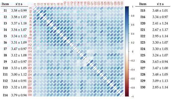According to the item analysis table, three items, particularly items 14, 16, and 20, exhibited inconsistency with the overall measurement. In particular, item 14 had nine scores with a correlation of <0.3, whereas items 16 and 20 each had five scores with a correlation of <0.3. Consequently, these items were removed to improve the overall measurement consistency. Before removal, item 14 had the highest mean score (3.79 ± 0.94), and item 20 had the lowest mean score (2.41 ± 1.24). After excluding these three items, item 12 had the highest mean score (3.64 ± 0.91), whereas item 30 had the lowest mean score (2.85 ± 1.14), as shown in the model (Figure 1).