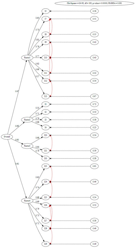 The path diagram of the model illustrates the correlation of the error terms among the specific measurements within the four factors. Red lines represent error associations. The model includes error covariances between I28 and I29, I26 and I27, I23 and I24, I12 and I13, I10 and I11, I7 and I8, I9 and I10, I7 and I12, I27 and I28, I20 and I21, I24 and I25, and I26 and I28. These error covariances were based on the assumption that measurement errors are correlated with certain observed variables and are, therefore, selectively applied among specific observed variables within the factors. The path diagram for the second-order confirmatory factor analysis demonstrated a good fit and yielded successful results according to the index ranges in Table 3 (Figure 2).