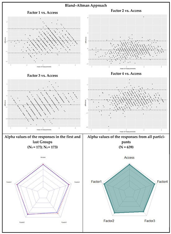 The Bland–Altman approach was used to examine the similarity between the averages of the scores derived from the factors and the overall score. All factors included 0 within the 95% confidence interval, and the middle line was very close to 0, indicating that, on average, the factors demonstrated consistent alignment with the overall score. In contrast, Cronbach’s alpha coefficients derived from the responses of the first 27% of participants (173 individuals) are shown in blue in the radar graph in the bottom-left corner. These values were 0.894 for Factor 1, 0.851 for Factor 2, 0.745 for Factor 3, 0.885 for Factor 4, and 0.942 for Access. For the last 27% (173 participants), these values are represented by a dashed red line and were 0.906 for Factor 1, 0.828 for Factor 2, 0.802 for Factor 3, 0.899 for Factor 4, and 0.950 for Access. These results were considered highly similar, indicating sufficient reliability for Factor 3 and high reliability for the remaining factors. The final Cronbach’s alpha coefficients of the complete measurement tool, which were calculated for all participants, are displayed in the bottom-right corner of Figure 3. These values were 0.899 for Factor 1, 0.825 for Factor 2, 0.773 for Factor 3, 0.892 for Factor 4, and 0.943 for Access, representing the entire scale (Figure 3).