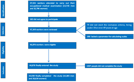 - Álvarez-Fernández, C.; Romero-Saldaña, M.; Álvarez-López, C.; Molina-Luque, R.; Molina-Recio, G.; Vaquero-Abellán, M. Gender differences and health inequality: Evolution of cardiovascular risk in workers. Arch. Environ. Occup. Health 2021, 76, 406–413. [Google Scholar] [CrossRef] [PubMed]