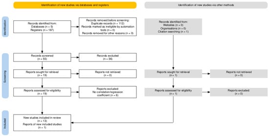 The searches performed in the five databases resulted in a total of 167 records. The records were imported into the Rayyan web application [25] to automatically detect and remove duplicate studies, leading to the removal of 112 studies. Using the same web application, the titles and abstracts of the remaining 55 records were independently reviewed by two of the researchers, resulting in a total of 36 excluded studies that did not meet the inclusion criteria. In case of conflict, a third researcher was consulted to make the final inclusion/exclusion decision. After obtaining the 19 full-text papers, the studies were again reviewed independently by 2 members, excluding 6 records and leaving a total of 13 studies. Figure 1 presents the process followed according to the PRISMA guidelines [22,23].