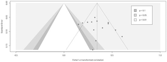 We produced a funnel plot to measure publication bias across studies, looking at the relationship between precision and observed effect size of studies (Figure 2). A funnel plot is a graphic technique for assessing potential publication bias where “an unbiased sample would ideally show a cloud of data points that is symmetric around the population correlation coefficient and has the shape of a funnel” [29] (p. 686). In addition, Egger’s regression test was calculated to check the asymmetry of the funnel plot, obtaining a coefficient of 1.695 (9%CI: −1.78, 5.17), t = 0.96, p = 0.36. In this sense, Eggers’ test does not indicate the presence of funnel plot asymmetry.