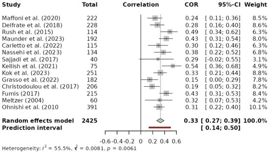 The relationship between moral distress and emotional exhaustion in the selected studies ranged from 0.15 to 0.54. No significant association between both variables was observed in the study of Grasso et al. [31]: r = 0.15, p > 0.05. The meta-analysis showed that moral distress and emotional exhaustion were positively and significantly related (g = 0.33, p < 0.001; 95%CI: 0.27, 0.39) (Figure 3). The total number of participants included in the meta-analysis was 2.245 (k = 14). The Q-value was 29.20 (p < 0.01). The between-study heterogeneity variance was estimated at tau2 = 0.0081 (95%CI: 0.0337, 0.1835), with an I2 value of 55.5% (95%CI: 18.9%, 75.6%). The prediction interval ranged from g = 0.13 to 0.50, indicating that a positive correlation may be expected for future studies. After running the diagnosis of influential cases and the graphic display of heterogeneity [44,45], no study was detected as an outlier and/or influential case.