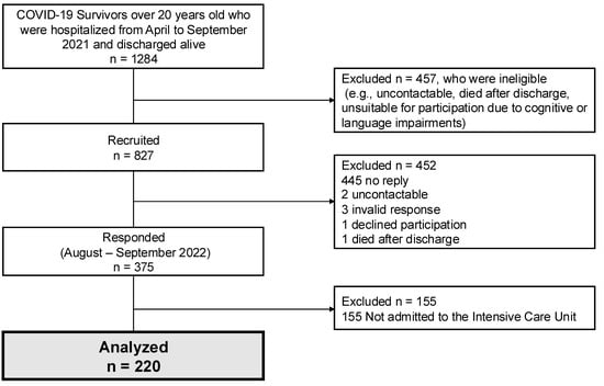 The present study had several limitations. There was a recall bias because the survey was conducted approximately one year after discharge. Furthermore, there was a survival bias because only surviving patients were included in the survey. There was also a selection bias because those with difficulty completing the questionnaire were excluded. These biases led to lower internal validity and represented significant limitations of this study. Another limitation is that some patients may originally have had a physical impairment. In addition, the self-report assessment methods used in the present study were validated with regards to physical function and mental health; however, only self-reported assessments were conducted. The present study was also based on a mailed questionnaire, and responses to the questionnaire were allowed to be substituted by family members if the patient was unable to respond directly, which may have resulted in better or worse patient ratings by family members. Another limitation is that PICS studies conducted using different assessment tools may not be comparable, and minor physical disabilities may have been missed when using the modified MRC score. Because we were not able to obtain detailed data on patients who were not admitted to the ICU or who were not hospitalized, we were not able to compare patients who were admitted to the ICU with those who were not admitted to the ICU or who were not hospitalized. The risk of recall bias is a common limitation among studies investigating the long-term consequences of COVID-19 using retrospective questionnaires [43,44]. To minimize this bias and provide more reliable estimates of symptom prevalence and trajectories, future studies should employ prospective designs with repeated assessments from the acute phase to long-term follow-up [29]. Such studies would also allow for a more granular analysis of the temporal dynamics of symptom development and persistence, which is critical for understanding the natural history of long COVID [57].