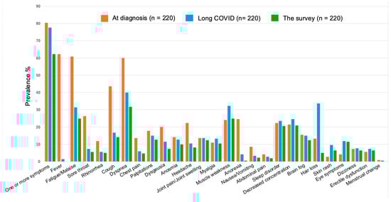 Twenty-six symptom outcomes were selected from the International Severe Acute Respiratory and Emerging Infections Consortium follow-up questionnaires. The prevalence of symptoms of the International Severe Acute Respiratory and Emerging Infections Consortium. The population of each was 220 cases, and the percentages of symptomatic cases are shown in the figure. From left to right, the percentage of patients who were symptomatic at the time of severe acute respiratory syndrome coronavirus 2 (SARS-CoV-2) (orange), the percentage who had the continuation or development of new symptoms 3 months after the initial SARS-CoV-2 infection, with these symptoms lasting for at least 2 months (Long COVID) (light blue), and the percentage who had persistent symptoms until the questionnaire survey (green).
