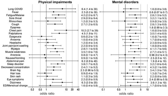 Odds ratios for physical impairments and mental disorders. The results of multiple logistic regression analyses of physical impairments and mental disorders are shown in a forest plot. Functional impairments were adjusted for age, sex, obesity, sequential organ failure assessment scores on intensive care unit admission, delirium, mechanical ventilation, and long COVID symptoms. ED; erectile dysfunction.