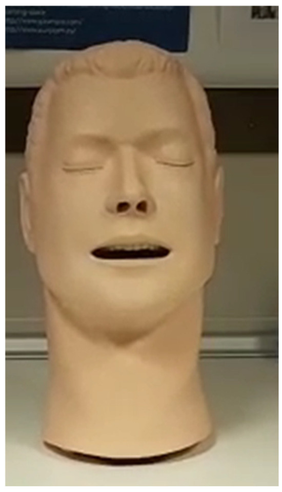 For sound emission, an anatomical head model from a Laerdal Airway Management Trainer© (Laerdal Medical, Madrid, Spain) (Figure 2), commonly used for oro-tracheal intubation training, was utilized. Inside the vocal cavity, a Bluetooth speaker (Sony SRS-XB13© Sony, Madrid, España, small size—width: 76 mm; depth: 76 mm; height: 95 mm, with a sound power of 5 W and a frequency range of 20 to 20.000 Hz) was sealed within the mouth using sound-absorbing polyurethane foam to minimize internal sound reverberation. An opening measuring 6 × 30 mm at the lip allowed the head to emit voice signals and noise. The different respiratory protection devices (face masks and PAPR equipment) were mounted on or over the head.