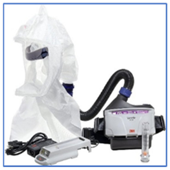 The PAPR (Powered Air-Purifying Respirator) (Figure 3) system features a hood that covers the wearer’s head and is connected to a ventilation unit that supplies filtered air from the external environment. This system is particularly advantageous in high-risk situations, as it provides a continuous flow of clean air. In this study, the equipment used included the 3M Versaflo© TR-300MR blower, 3M Madrid, Spain, (weighing 1095 g), which is worn around the waist with a belt, accompanied by a head harness and a hood extending to the shoulders (model S-655-L). This ventilator maintains a nominal airflow rate of 190 L/min, ensuring adequate respiratory protection while enhancing comfort during prolonged use, making it a valuable option for healthcare professionals working in environments with a high risk of airborne pathogens.
