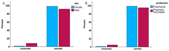 The multivariate analysis confirms that females (p = 0.007) and the pharmacist profession (p = 0.005) demonstrated greater knowledge regarding the main etiological agent of VVC (Table 4), although both sexes and professions exhibited high levels of knowledge (Figure 1).