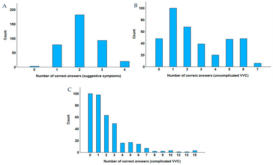 Bar plot of the number of correct answers of (A) suggestive symptoms; (B) uncomplicated VVC; and (C) complicated VVC.