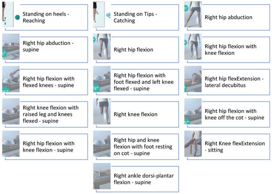 Early mobilization focused on reducing postoperative swelling and regaining range of motion through active exercises (Figure 1). Also, isometric strengthening of the quadriceps and hamstrings was introduced to prevent muscle atrophy. All exercises were performed with weight-bearing and active ROM as tolerated by the patient [10,11,24]. The exercises were performed under real-time monitoring by a physiotherapist connected remotely from the hospital (Figure 2). This was made possible by the patient wearing motion-detection devices, allowing the therapist to assess movement accuracy and provide immediate feedback, ensuring safe and effective execution while adhering to the prescribed limitations. The isometric exercises were also performed with the physiotherapist connected through the Khymeia system; however, these exercises were not included in the system’s database.