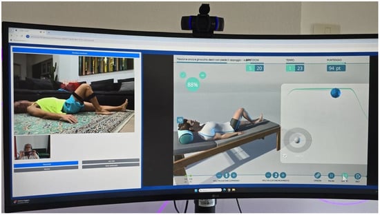 The technology used for delivering telerehabilitation programs is the Khymeia system (Virtual Reality Rehabilitation System, VRRS of the Khymeia group, Noventa Padovana, Italy; https://khymeia.com/it/; accessed on 9 February 2025), a Class I certified medical device designed for remote rehabilitation, that has been validated in previous studies for its reliability in motor rehabilitation and its effectiveness in telemonitoring-based physiotherapy [14,15,16]. It offers advanced solutions for both patients and clinicians, especially virtual reality environments and motion tracking, which facilitate precise feedback and progress tracking. After an initial in-person training, the telerehabilitation sessions were delivered synchronously, with a frequency of 5 times per week, each lasting one hour, for a total number of 25 sessions. From a nutritional standpoint, the patient adhered to a well-balanced diet during the rehabilitation phase, ensuring adequate intake of both macro- and micronutrients. Proper nutrition throughout this period plays a critical role in enhancing lean body mass, muscular strength, and overall functionality, thereby facilitating a quicker return to daily activities [17,18,19]. In agreement with Smith-Ryan et al. [20], consuming sufficient nutrients prior to rehabilitation sessions optimizes energy availability and exercise performance, while post-session intake supports recovery and physiological adaptation. Consistent with findings from other studies, protein intake was approximately 1.6 g/kg/day [20,21,22]. In particular, starting 3–4 h before a therapy session, the patient was consuming a small meal containing complex carbohydrates (50–100 g) and quality protein (30–40 g) [22]. Beyond protein intake, the diet was supplemented with creatine monohydrate, β-hydroxy-β-methylbutyrate (HMB), omega-3 fatty acids, probiotics, and vitamins to further support muscle mass, strength, and functional improvements during rehabilitation [20,22,23].