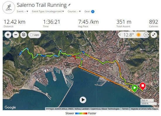 Dynamic strength training incorporated both closed-chain exercises and plyometric movements to enhance knee stability and strength, which are essential for returning to sport-specific activities. These exercises were not included in the Khymeia system’s database but were taught in person by the physiotherapist and monitored remotely using the system. The patient’s progress was closely monitored on a weekly basis using telerehabilitation tools, allowing the therapist to tailor exercise intensity as needed. Additionally, the patient reintroduced running, starting with one weekly session of 15 min, which included both a warm-up and cool-down to promote gradual adaptation and minimize the risk of re-injury. However, during the running training session in the eighth week, the patient performed a slight rotational movement of the knee near the end of the workout, causing swelling and pain rated at 7 on the VAS scale. Nevertheless, after five days of rest with ice application three times a day, he was able to resume his reconditioning program. After this event, the patient resumed training with cycling and swimming, while running was reintroduced at the beginning of the tenth week. Initially, this included two weekly sessions of approximately 30 min each, during which the patient reported mild discomfort only during the warm-up phase. By the end of the twelfth week, he was able to return to trail running, completing a 12.42 km route (Figure 4).