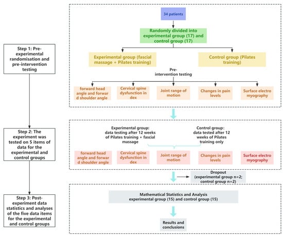 The study was a single-blind, randomized controlled trial, using a random number table method to divide participants into two groups. An experimental group included Pilates training combined with fascial massage, and a control group included Pilates training alone. The experimental flow is shown in Figure 1.