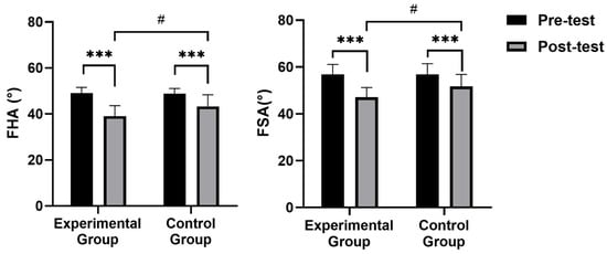 Comparison of forward head angle (FHA) and forward shoulder angle (FSA). Note: *** significant difference within groups (p < 0.001); # significant difference between groups (p < 0.05).