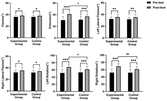 Comparison of cervical range of motion. Note: * significant difference within groups (p < 0.05); ** significant difference within groups (p < 0.01); *** significant difference within groups (p < 0.001); # significant difference between groups (p < 0.05); ## significant difference between groups (p < 0.01).