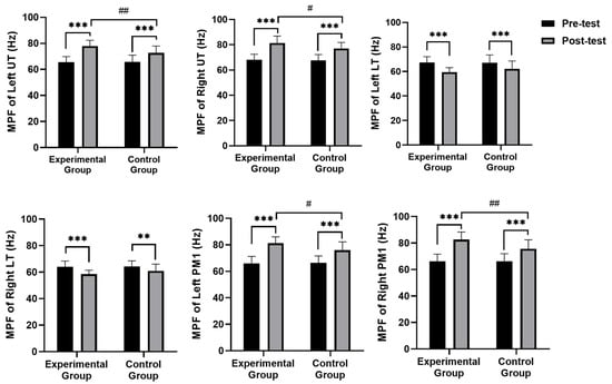 Comparison of frequency domain metrics mean power frequency (MPF) of surface electromyography (sEMG). Note: UT—upper trapezius; LT—lower trapezius; PM1—pectoralis major; ** significant difference within groups (p < 0.01); *** significant difference within groups (p < 0.001); # significant difference between groups (p < 0.05); ## significant difference between groups (p < 0.01).