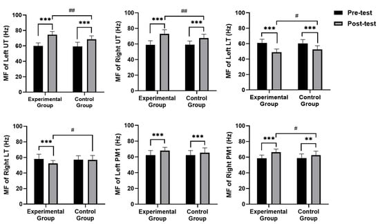 Comparison of frequency domain metrics median frequency (MF) of surface electromyography (sEMG). Note: UT—upper trapezius; LT—lower trapezius; PM1—pectoralis major; ** significant difference within groups (p < 0.01); *** significant difference within the group (p < 0.001); # significant difference between groups (p < 0.05); ## significant difference between groups (p < 0.01).