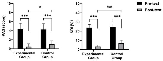 Comparison of visual analog score (VAS) and neck disability index (NDI). Note: *** significant difference within groups (p < 0.001); # significant difference between groups (p < 0.05); ### significant difference between groups (p < 0.001).