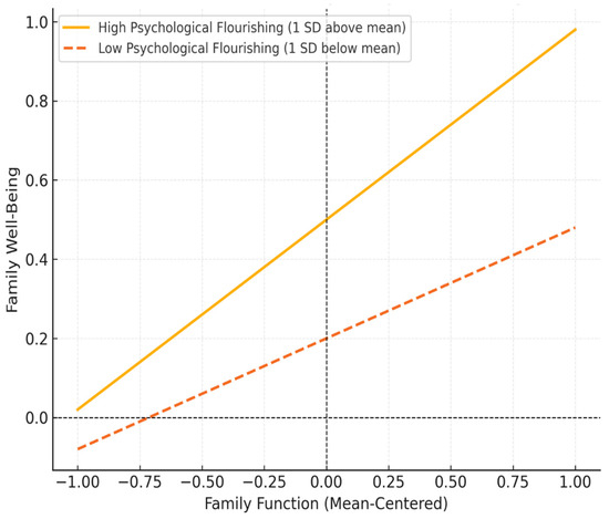 Simple slopes analysis further demonstrated that when psychological flourishing was high (1 SD above the mean), the effect of family function on family well-being was stronger (β = 0.48, p < 0.001). In contrast, when psychological flourishing was low (1 SD below the mean), the effect was weaker but still significant (β = 0.28, p < 0.01).