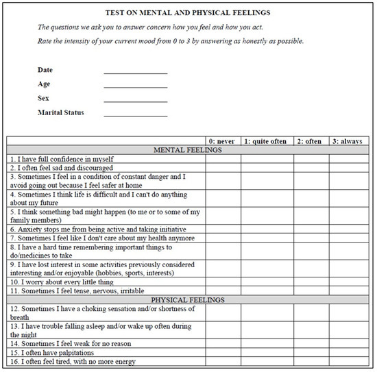 In addition to evaluating clinical outcomes, this pilot study aims to determine the efficacy of a newly developed questionnaire designed to assess the psychological health of patients with CRSwNP undergoing treatment with Dupilumab. In this regard, the questionnaire that constitutes the psychological survey was created by a clinical psychologist and proposed to patients by the authors of the present paper in Italian. The concept of the survey was started in February 2024. The final survey design was completed in May 2024 after being reviewed by all authors. Medical students carried out the survey via e-mail and direct phone calls to patients undergoing treatment, and survey responses were collected up to and including October 2024. Figure 1 shows the questionnaire translated into English, comprising sixteen items subdivided into two parts: a first section (eleven questions) investigating mental sensations and a second section (five questions) assessing physical sensations. The questions cover how patients feel and act by rating the intensity of a specific sensation from 0 to 3. Except for the first question, where a high score indicates a good state of trust on the part of the patient, for all the other questions, a high score represents the maximum discomfort expressed; therefore, a score of 3 indicates severe psychological distress.