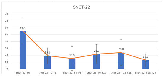 SNOT-22 trend over time. T0: Baseline; T1–T3: between 1 and 3 months of treatment; T3–T6: between 3 and 6 months of treatment; T6–T12: between 6 and 12 months of treatment; T12–T18: between 12 and 18 months of treatment; T18–T24: between 18 and 24 months of treatment.