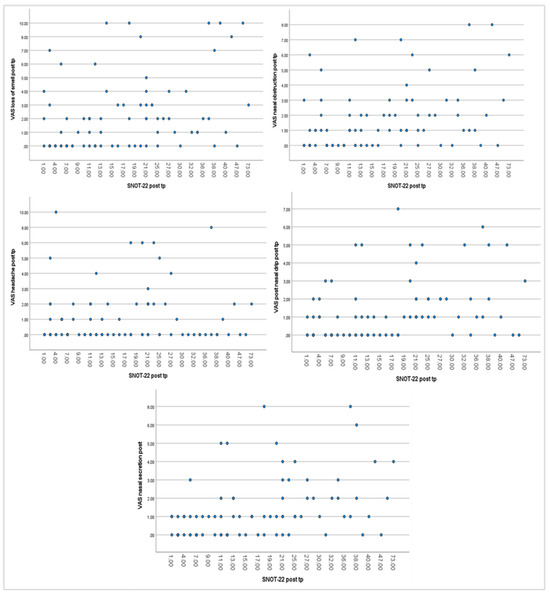 Correlations between PROMs. VAS represents the ordinate variable; the SNOT-22 represents the abscissa variable.