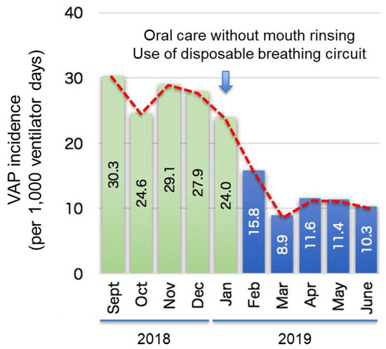 In Vietnam, VAP incidence at tertiary hospitals in Vietnam was reported at 8.7 per 1000 ventilator days in 2017 [19]; however, anecdotal evidence suggests that VAP is more prevalent and remains an urgent issue. The emergence of multidrug-resistant bacteria has further increased the importance of VAP prevention [20,21,22,23]. We developed a 10-item VAP care bundle in 2018 to address the high incidence of VAP in Vietnamese ICUs. The VAP care bundle approach showed efficacy in preventing VAP amid the COVID-19 pandemic in Vietnam [24] and Japan [25]. However, the VAP incidence was slightly and not significantly reduced during the first six months of the care bundle’s implementation. Disseminating the 10-item VAP care bundle was challenging. In 2019, we updated 2 of the 10 items of the VAP care bundle protocol with interactive education, and VAP incidence decreased. This study aimed to review how the VAP care bundle, which did not work at the time of implementation despite high compliance rates, could be made to work effectively to reduce VAP incidence via protocol updates with interactive education in a resource-poor and multidrug-resistant environment.