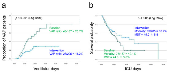 Graphs of proportion of VAP patients–ICU days (a) and survival probability–ICU days (b) before and after updates of the VAP care bundle (oral care and breath circuit management) and interactive communication and bedside education. VAP: ventilator-associated pneumonia; ICU: intensive care unit; MST: median survival time.