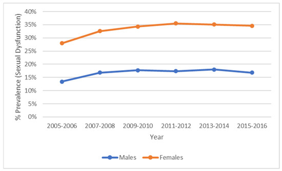 In this nationally representative cohort, we found that between 2005–2016, sexual dysfunction increased 25% for males and 22% for females. This increase trend has been reflected in research conducted in various populations previously. We also found that females have a higher percentage of sexual dysfunction than males. According to a previous cross-sectional study, researchers found that females experience more (43% vs. 31%) sexual issues than males [25]. Additionally, while Li et al. [26] found that mental dysfunction has an impact on sexual frequency, Davis et al. [27] found that the common denominator between the connection of chronic diseases and poor sexual health is chronic inflammation, which may be counteracted through higher sexual frequency. Finally, researchers found that there is a strong connection between CVD and sexual behavior due to increased inflammation that simultaneously affects both [28,29].