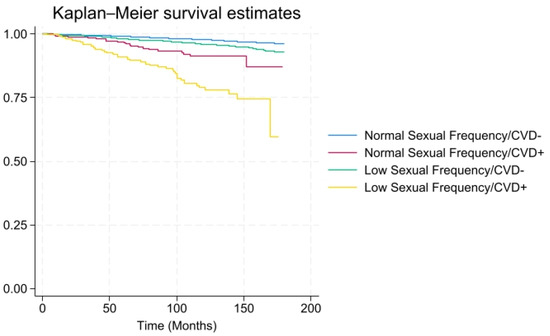 We also found that after controlling for confounders, low sexual frequency alone is correlated with an increased likelihood of mortality. Additionally, when the CVD and low sexual frequency status was positive, there was a higher overall mortality than those individuals that have low sexual frequency or CVD individually. To our knowledge, this was the first time that anyone has found, through mortality follow-up, that there is a connection between chronic disease and sexual health. The cardiovascular system plays a central role in sexual health by ensuring adequate blood flow to the genital organs, especially in male penile engorgement [35]. Inflammation, allostatic load, and hormonal imbalance can all be mechanisms through which chronic diseases are connected sexual dysfunction.