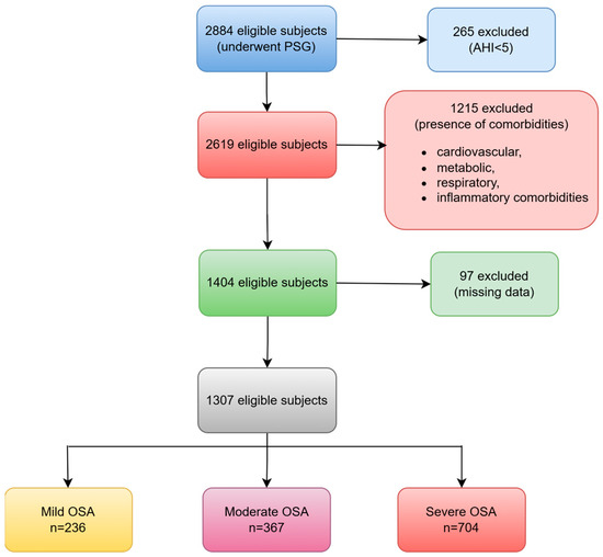 Out of the 2884 adults who were assessed for suspected OSA, 2619 of them (91%) received a confirmed diagnosis of OSA. Following the exclusion of patients with specific comorbidities and missing data, our final sample comprised 1307 patients (Figure 1).
