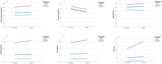 Comparison of arousal index (A), sleep latency (B), WASO (C), AHI (D), ODI (E), and TST90 (F) between sleepy and non-sleepy groups within OSA severity groups.