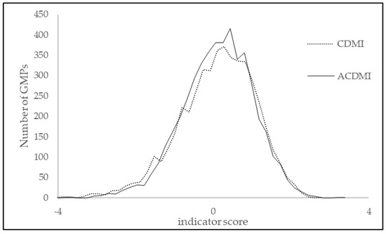 Using the nonstandardized linear regression coefficients from the regression model, the effects of the explanatory variables were removed from the CDMI values. The distribution of the adjusted CDMI values (ACDMI) was compared with the distribution of the CDMI values. GMPs with extreme positions were identified as those with scores falling below the 2.5th percentile (extremely low) or falling above the 97.5th percentile (extremely high). The extreme GMPs were categorized as follows: