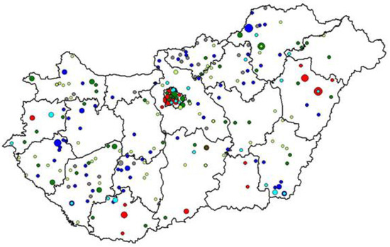 Spatial distribution of general medical practices (GMPs) with extreme composite indicators by the explanatory role of the structural characteristics of GMPs. (Dark blue: GMPs with extremely low CDMI and extremely low ACDMI, lowCDMInonstructural. Grey: GMPs with extremely low CDMI but not extremely low ACDMI, lowCDMIstructural. Dark green: GMPs with extremely high CDMI and extremely high ACDMI, highCDMInonstructural. Red: GMPs with extremely high CDMI and not extremely high ACDMI, highCDMIstructural. Light green: GMPs with not extreme CDMI but extremely high ACDMI, highACDMInonstructural. Light blue: GMPs with not extreme CDMI but extremely low ACDMI, lowACDMInonstructural. Size of the symbol is proportional to the number og GMPs with certain characteristics in a settlement).