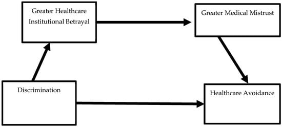 In addition to HIB, trust may also play a mediating role in the relationship between discrimination and anticipated healthcare avoidance. Specifically, medical mistrust is another well-documented cause of healthcare avoidance behavior [37,38,39], especially for marginalized populations (e.g., BIPOC populations, LGBTQIA+, people of low SES). Multiple factors have been associated with increased mistrust levels, including previous negative healthcare experiences [39], poor insurance status [25], and anticipated or prior experiences with racial discrimination [40]. In addition, previous negative experiences with healthcare systems can significantly influence an individual’s “subsequent healthcare-seeking behaviors” [41]. As such, understanding the relationship between medical mistrust and healthcare avoidance behavior is also critical to reducing the negative public health impacts associated with avoidance of care.