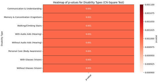 A heatmap for the p-values for Saudi population with disabilities by type/degree of difficulty and sex.