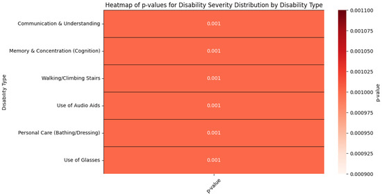 A heatmap for the p-values for disability severity distribution by administrative area.