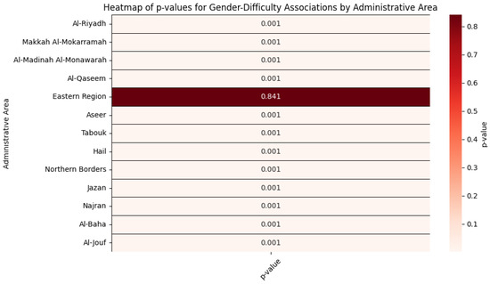 Chi-square tests of independence revealed statistically significant associations between gender and difficulty status in 12 of 13 Saudi administrative regions (p < 0.001), with trivial to small effect sizes (Cramer’s V = 0.019–0.048). For example, in Jazan, males disproportionately reported difficulties (46,257 males vs. 41,091 females; χ2(1) = 1942.5, V = 0.045), while Al-Madinah Al-Monawarah showed a similar male-skewed pattern (52,771 males vs. 46,134 females; χ2(1) = 1233.6, V = 0.032). The Eastern Region was the sole exception, showing no gender disparity (p = 0.841). See Table 5 and Figure 3 for statistical details.