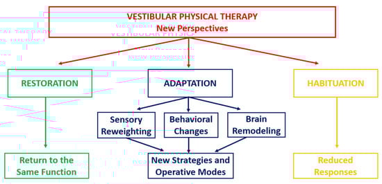 Several studies focused on vestibular recovery in animal models have provided a robust theoretical framework for understanding the compensation mechanisms following vestibular dysfunction [24,25]. According to these studies, improvements in vestibular function rely on the three key mechanisms previously defined: restoration, adaptation via sensorimotor substitution, and habituation. These mechanisms are part of the brain’s neuroplastic response to vestibular loss. They drive full synaptic remodeling of the pathways (restoration); functional reorganization of neuronal networks through the use of sensorimotor strategies drawn from the behavioral repertoire, or by creating new substituting modes (adaptation); and an improvement in the ability to ignore or reduce the response to disturbing stimuli (habituation). All these mechanisms reflect the brain’s orchestration of neuronal network remodeling, which represents vicariant idiosyncratic melodies played by each vestibular patient, as illustrated in Figure 1.