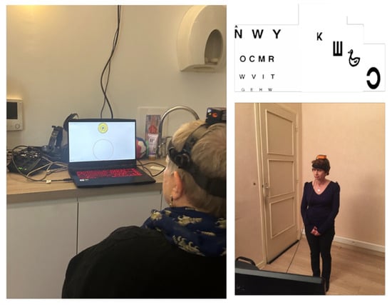 Figure 3. A dynamic visual acuity protocol for rehabilitation. The test can be performed actively by patients sitting in front of a laptop screen or standing in front of a high-resolution screen on which optotypes adapted for adults or young children are randomly presented for a duration of 50 ms. When recognized, the optotype size is then decreased in steps corresponding to changes of 1/10 on the Snellen visual acuity chart.