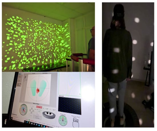 Figure 4. An experimental setup for optokinetic stimulation. Vestibular patients are asked to keep their balance on a posturography platform while submitting to an optokinetic stimulation made of white (right part) or colored (upper left part) dots moving in different planes at various velocities (20–100°/s), depending on the vestibular pathology. The center of foot pressure (lower left part) is shown as the red pathway of the stabilogram (between the two feet) together with the symbols used by the software to measure the recording time and the conditions used during the recording session, i.e., in both static (stable support) and dynamic (unstable support) conditions.