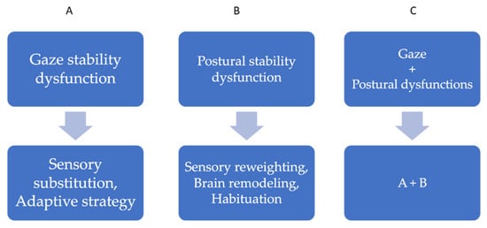 Substitution consists of exercises aiming to promote alternative strategies (e.g., preprogramming of eye movements) that substitute for missing vestibular functions [22,23].