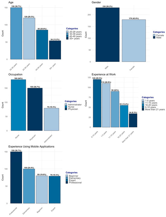 The study included 409 primary healthcare practitioners, representing a diverse range of ages, professional roles, work experience levels, and mobile application proficiency. The age distribution shows that the majority of participants were in the 30–39 years group (36.7%), followed by 20–29 years (29.3%), while 40–49 years (20.8%) and 50 years and above (13.2%) comprised smaller proportions (see Figure 1). The gender distribution was nearly balanced, with 230 female participants (56.2%) and 179 male participants (43.8%).