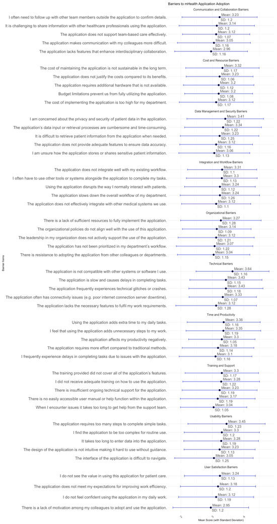 Figure 2 identified mean score and SD of key barriers affecting the adoption and use of the Sehaty application among primary healthcare practitioners. The findings highlight challenges across multiple dimensions, particularly technical performance, usability, training, workflow integration, data security, organizational support, communication, cost, productivity, and adoption barriers. These factors influence the system’s usability and effectiveness, requiring targeted improvements to enhance engagement and efficiency.